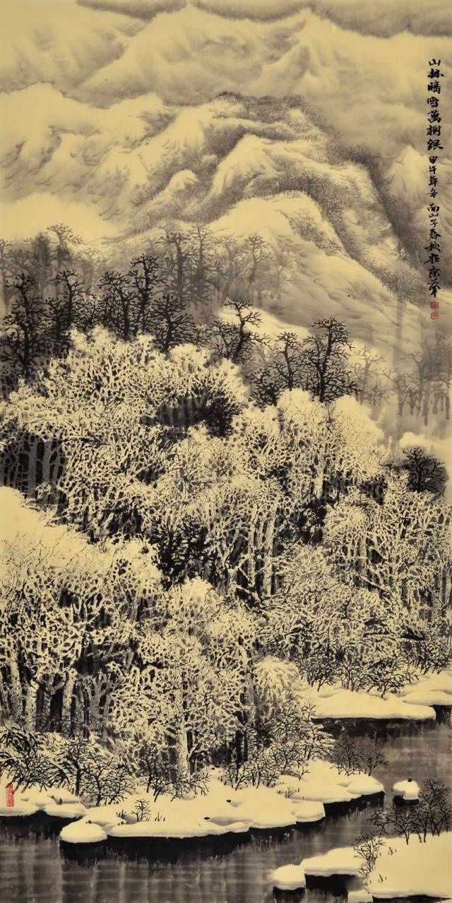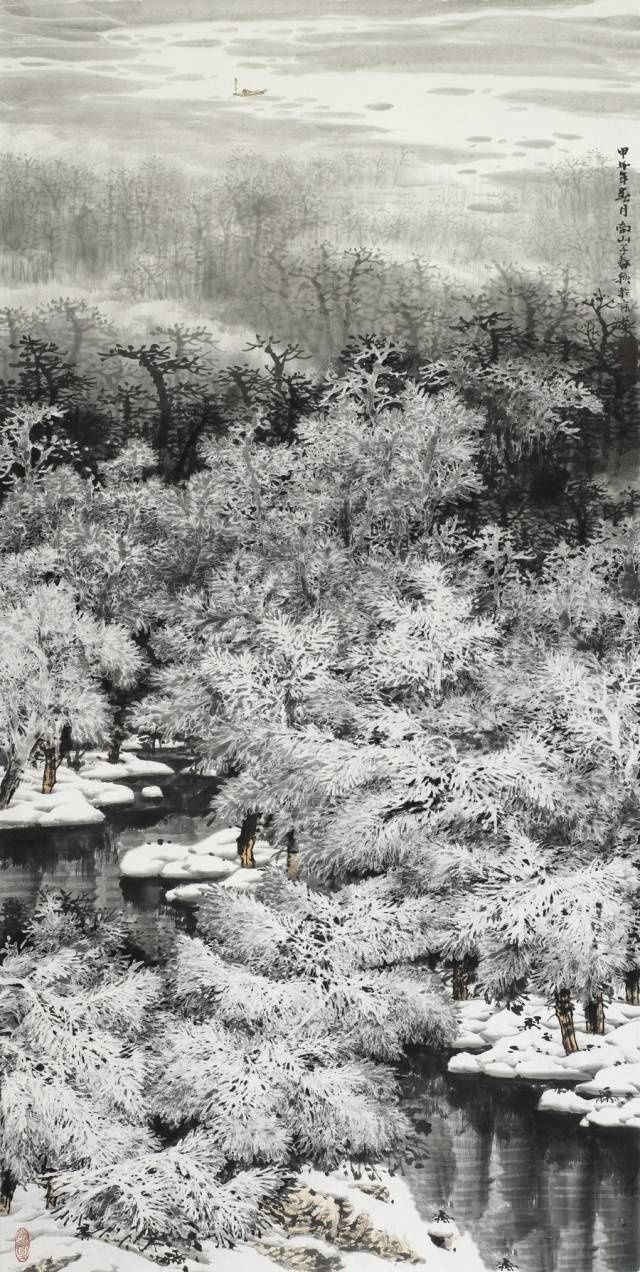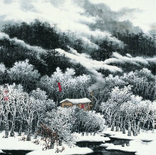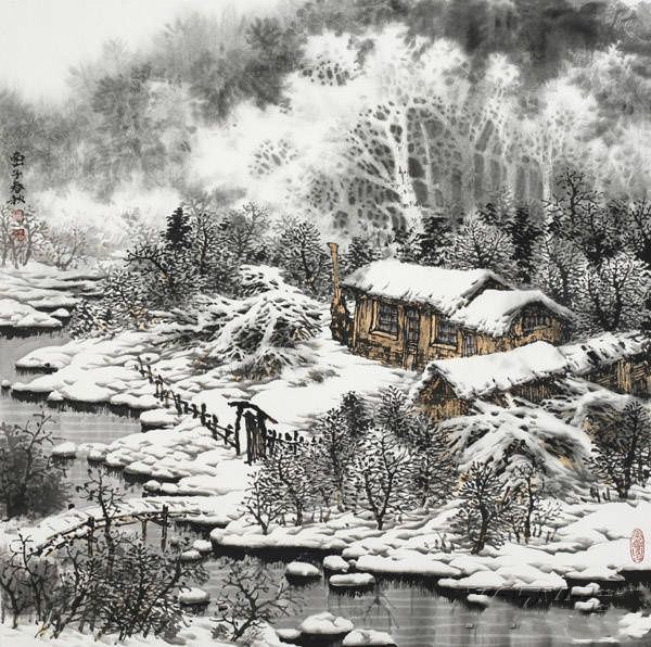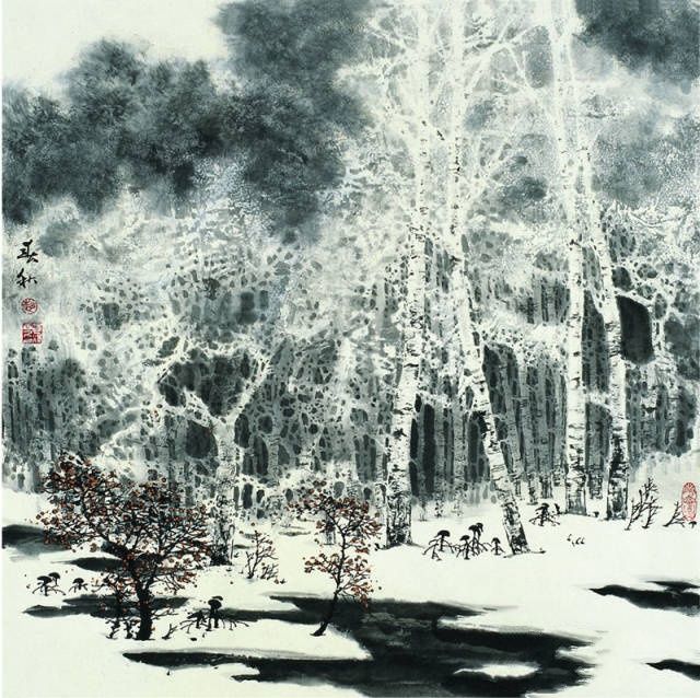 冰雪山水画中的白色树木,有时候是可以留白的,尽管需要很高的技巧,但是不耽误像普通山水画那样挥洒笔墨。
