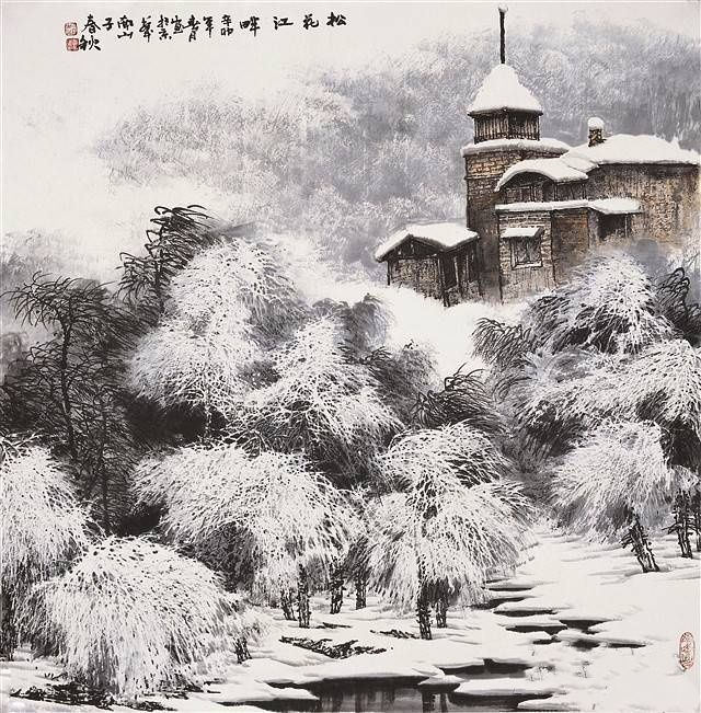 冰雪山水画,善于表现雾凇,这是传统绘画技巧里所没有的!