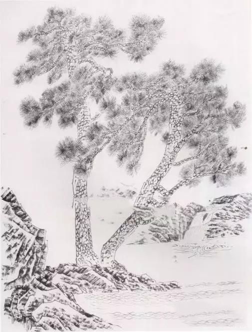 步骤五:用重墨提出前面实处的松针和松枝。进一步用浓墨染出山石的阴阳面。用头绿和淡墨点出小树叶。用重墨点苔和画出前面的小树。最好用石绿点苔,不够的地方进一步烘托。最后题款盖章。