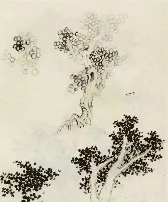 皴树皮不要一个个勾圆圈,要用长短不同、大小不同的方圆组成松皮,才不显死板。画整棵松树,树叶是由基本相同的单元组成,松针画法有半圆松针和圆松针两种,画松针时要注意参差错落和疏密的分布。