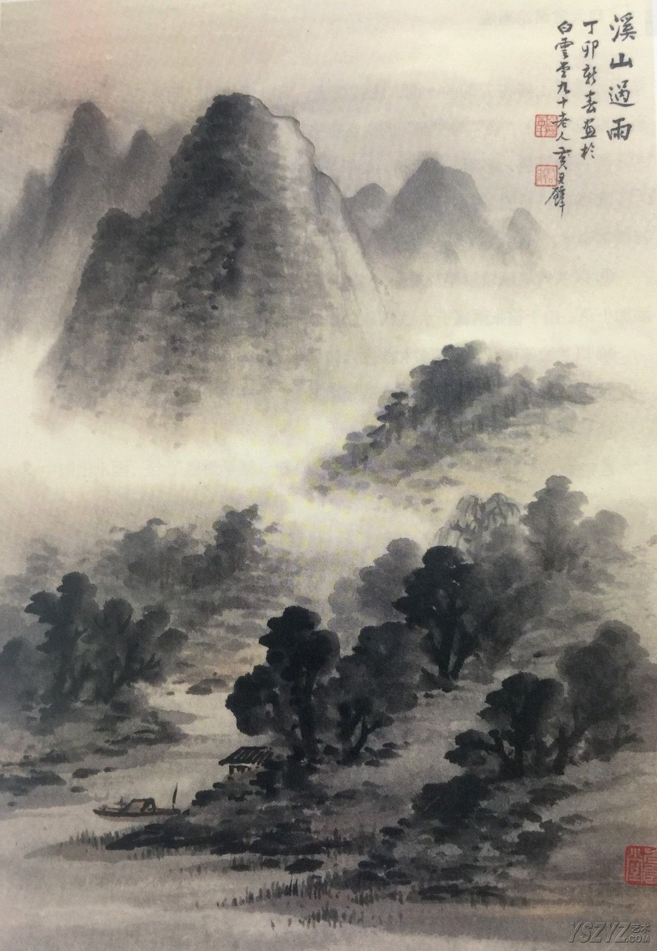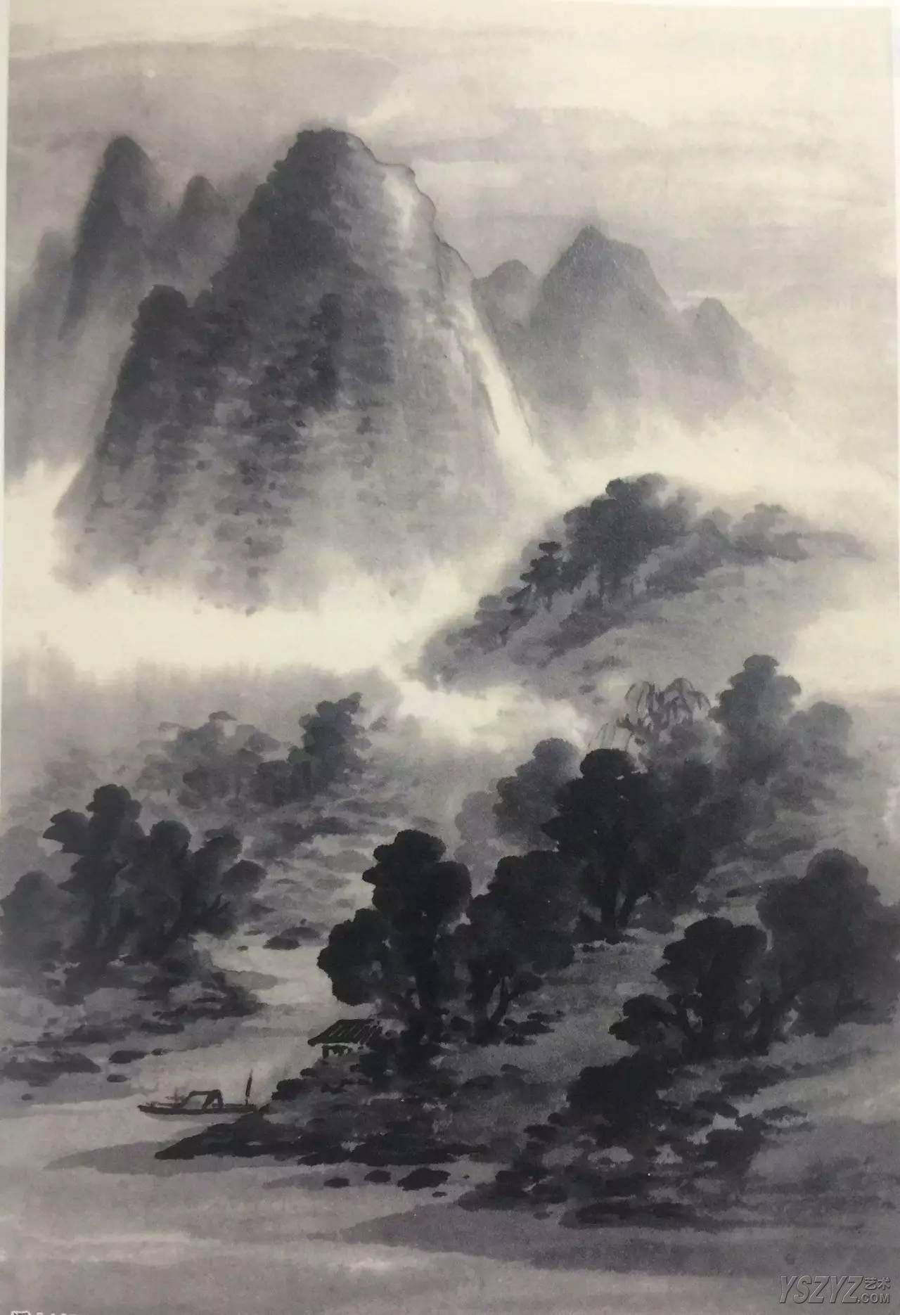 以由上向下的大侧锋笔法染远山,但笔触到山腰处止住,留出一横条环山的云气,再染运下方的阴暗处。不能前述的墨干,接着以清水再云雾处晕染,使上下的墨色向云雾间湮开,造成雨的效果。