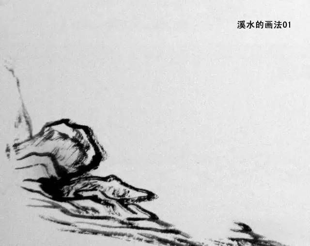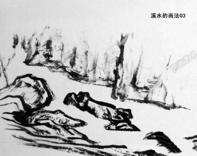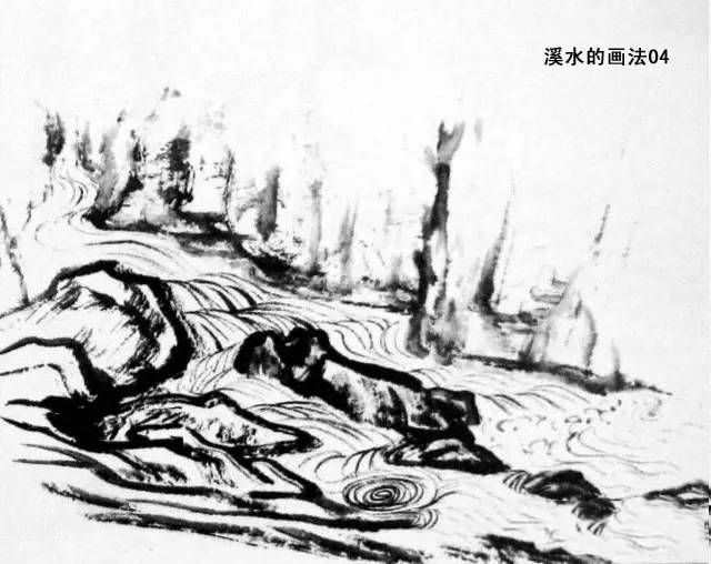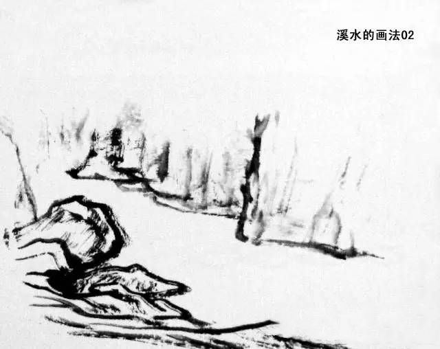 山有泉瀑而活,画溪水要有曲折转回和掩藏呼应。再用墨块点出水中乱石,石块要有大小、浓淡和聚散的变化。