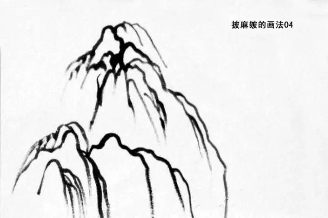步骤05:山石勾勒完成之后,用侧锋或干笔进行皴擦。长披麻皴和短披麻皴结合使用。待墨干后用淡墨统一罩染,使山形更加整体化。↓↓↓