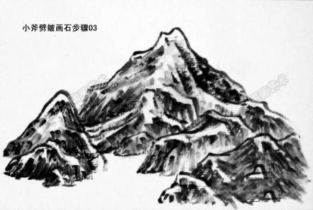 步骤03:待皴笔干后,用含水较多的淡墨染暗部,亮部留白,以加强立体感。↓↓↓
