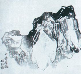 附图就是所谓的“大斧劈皴”。因其笔触所形成的切面肌理很像被利斧劈开的木材的截面,所以得名。具有这种肌理特征的山石在北方是十分常见的,而以表现北方山水著称的王颂余先生山水画的基本构成便源于此。图中通过笔触的长短大小、墨色的黑白干湿、用笔方向的偏侧斜正等多种变化组合,塑造出具有体积感、质感和量感的一块坚实的岩石。初学者在使用此种表现时多应该选择笔锋不是太长、笔毫不是太软的毛笔,画时要握笔稍稍远离笔锋,以便使笔管稍微呈倒伏状态,采用逆锋涩进慢行笔的方法,大胆果断地落笔:当然,这就要求我们对山石的自然形态有比较深入的观察和清晰的理解。