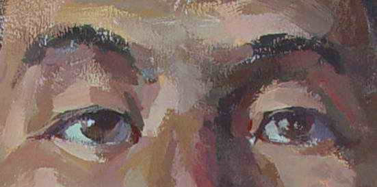 画眼睛时,应先画眼窝、眼球的形体特征,再画上下眼皮和眼球及虹膜等,一般中国人的眼珠是黑色的,可用深红、群青、熟褐等颜料调和。上眼皮背光,多用重 色表现,下眼皮一般多处在受光部分,稍微要浅一些。
