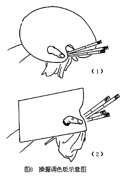 现代画家多数喜欢将调色板搁在桌上进行调色,绘制巨幅作品或野外写生时,才持调色板作画。持握调色板的传统方法如图8,手里的布块用于擦笔。