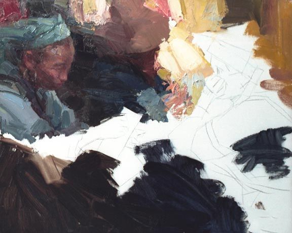 在每一个区域的帆布我努力使笔刷有趣的在他们自己的权利。一些地区厚,有些薄,水分多的,有些是用大刷子,而其他小或中等,甚至用调色刀。品种是关键在一切。认为在音乐的对位。柔软的微妙的域将更加柔和旁边时大胆,明暗差别强烈的地区。这一原则是真实的几乎每个方面的绘画——边缘、颜色、技术等。