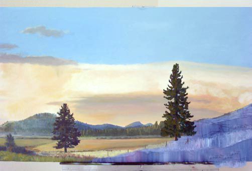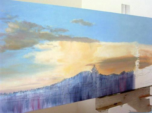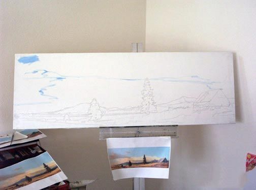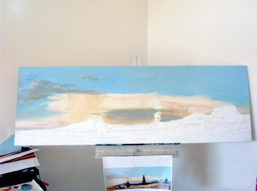 曾经我很满意我的绘画,我喷固定它(在我的车库)使用Kamar可行的固定剂允许足够的时间对固着干燥和气味消散。与画布早在我的工作室,我准备开始。云彩和天空应该是宽松的,所以我没有给自己任何铅笔指南在天空区域,我仅仅勾勒出它在与油漆。