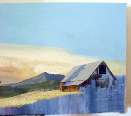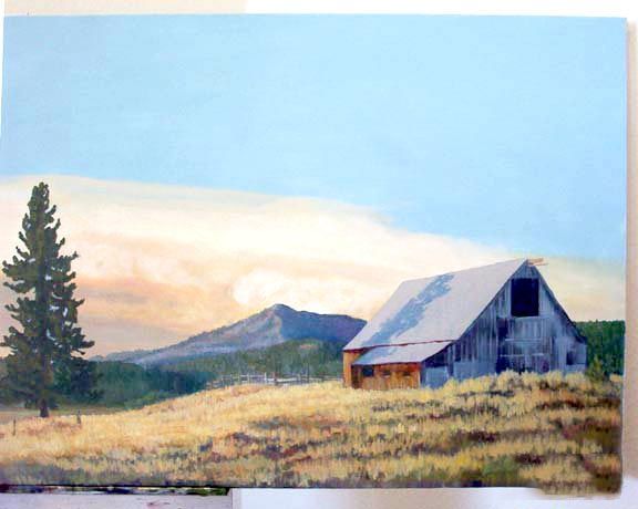 Things really start to come together when I begin to add the details to the shaded side of the barn. The mountains in the background, the grassy area, and this point of completion on the barn represent another couple of hours of painting.