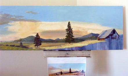 I then printed out an 11″ x 17″ print on my color printer (the maximum size my printer will output) for reference while painting. This was much better than the 4″ x 5″ photographic prints I had started with for obvious reasons: it was a lot bigger, the colors were closer to what I wanted to end up with, the sky was awesome, and it was in one piece.