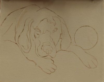 I begin by drawing the dog on a toned canvas. I added the ball to make the composition more interesting.