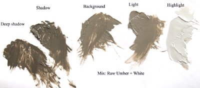 This is a palette of my actual underpainting paint compared to the color white. They are various mixtures of raw umber plus titanium white.