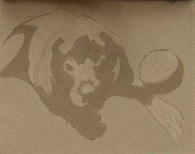 我把图的狗,把它分成光线和阴影。我用很厚的颜料在我underpaintings——没有帆布将显示通过。
