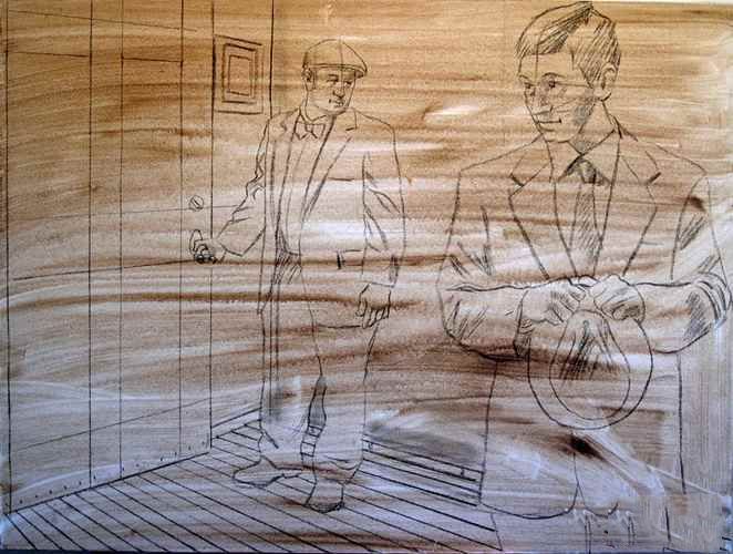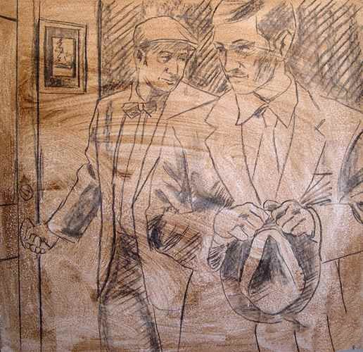 的伟大之处与葡萄树木炭在画布上画,当我犯错误或需要解决一些我所要做的就是把它擦掉了。当我设置”帽子,“我擦出零件图的脸和身体,重新划分直到他们是正确的。我还用标准和丁字尺吸引大部分的线路。