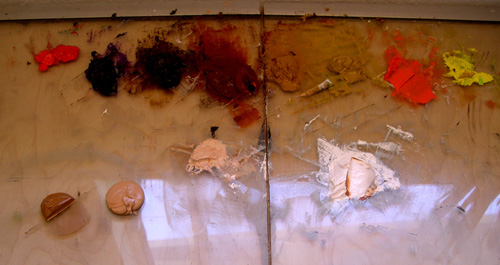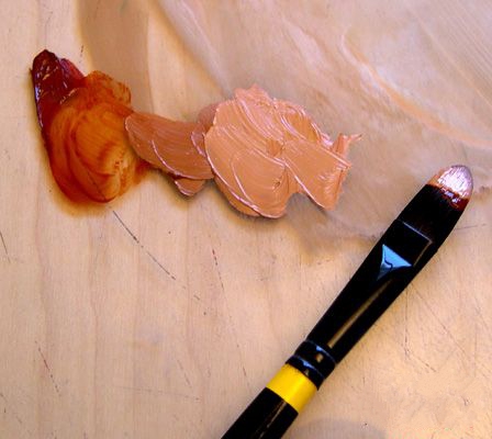 后修改我的画一点我先混合大大量的肤色与抹刀在玻璃表。对于我的肉体的语气,基本是镉橙、蓝、深褐色,白色。我使用这个作为基础,增加更多的白色我进入中档和黄色我进入一些亮点。轻的亮点,我有时使用酷白混烧棕土和白。