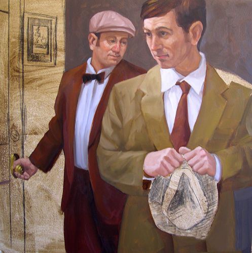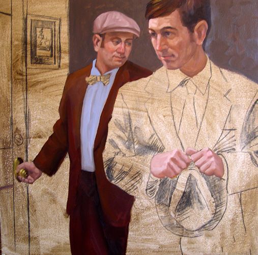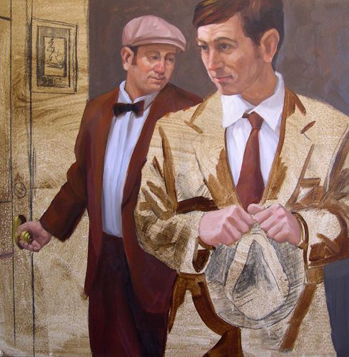 的灯光赭石和白色的衬衫是黄色的。领结使用相同的颜色的夹克,但保留在黑暗的值的范围。我使用的一些烧棕土混合galkyd偏暗的衬衫。