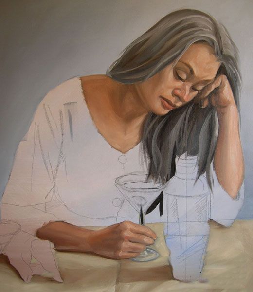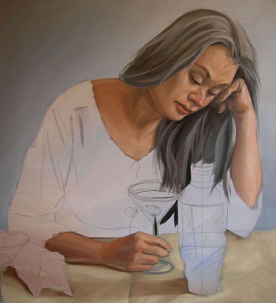 马提尼玻璃和瓶画透明的秘密和反光的表面(如玻璃,金属)是不要看所有形状的对象但看彩色的抽象形状由折射和反射区域。例如,背景墙的颜色是在玻璃的顶部突出的rim和阀杆。这个颜色也反映在液体中。甚至一些肉音调是折射整个玻璃,橄榄,混合从白色,佩恩的灰色和黄色赭石,出现在一群不同的反射玻璃。男性人物的玻璃,衣服的颜色也拿起右边的玻璃。注意,我不得不画手表,胳膊,手,男性人物之前我画马提尼玻璃确保边缘和反思他们应该工作。