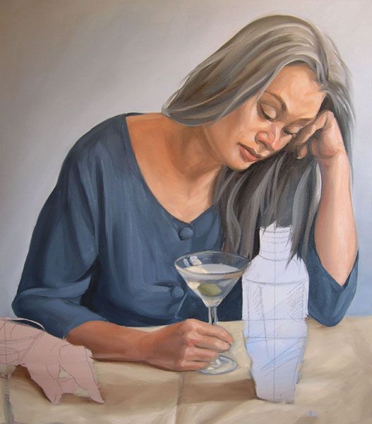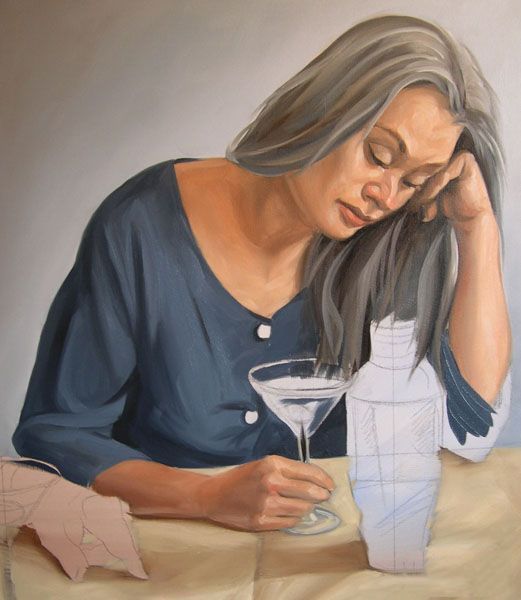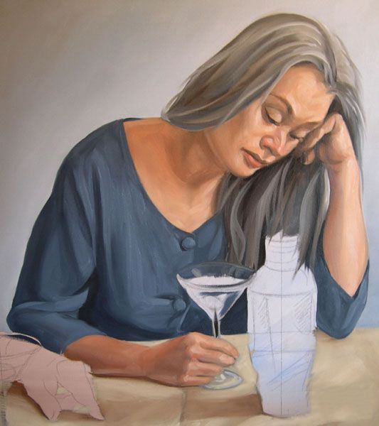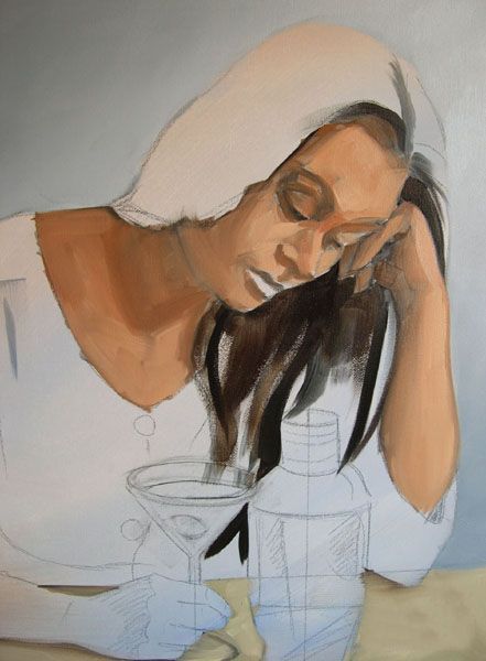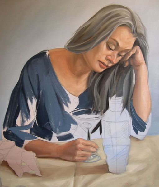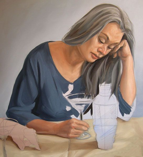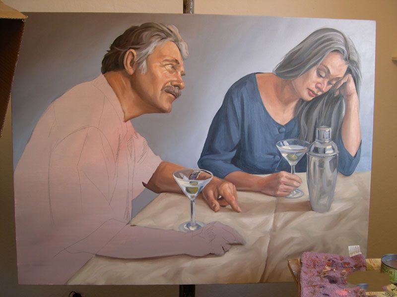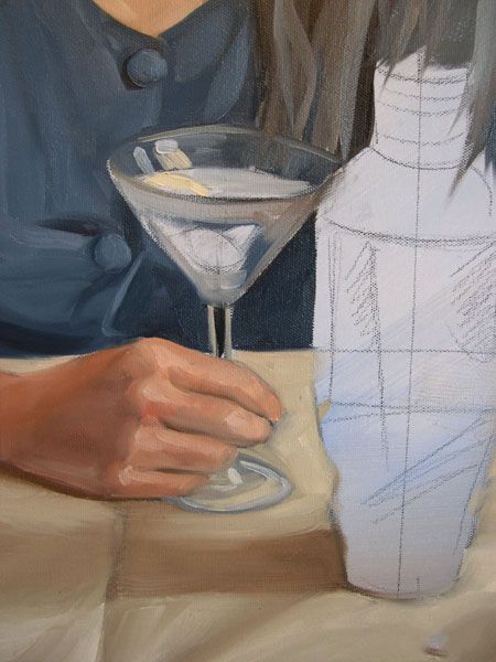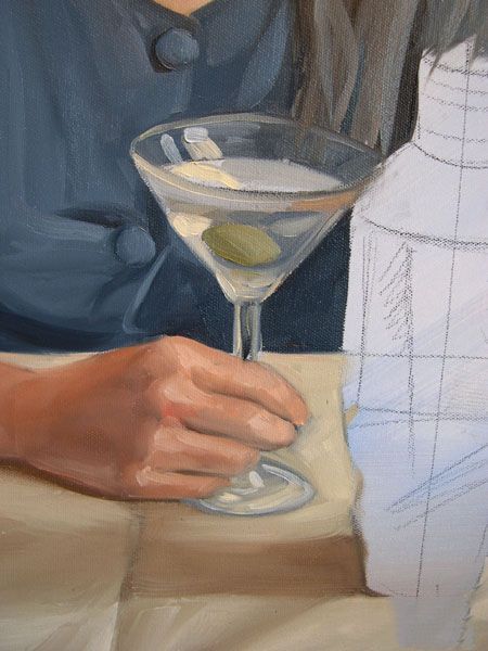 最后一步,在我的按钮是寻找亮点。请注意,在这一点上我开始预测马提尼玻璃的边缘。我寻找玻璃影响和如何减轻颜色通过它。服装和眼镜突出混合从最轻的语气联系更佩恩的灰色和白色的。正如你所看到的,我的大玻璃面板是成为塞满了我使用油漆的颜色背景,肉,桌布和衣服。我确保我有保存剩下的颜色混合,因为我需要它来刷马提尼杯马提尼瓶中的倒影。