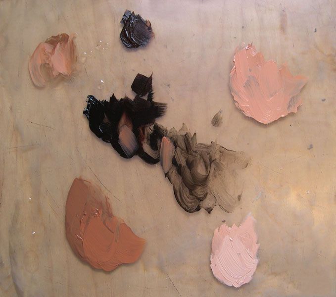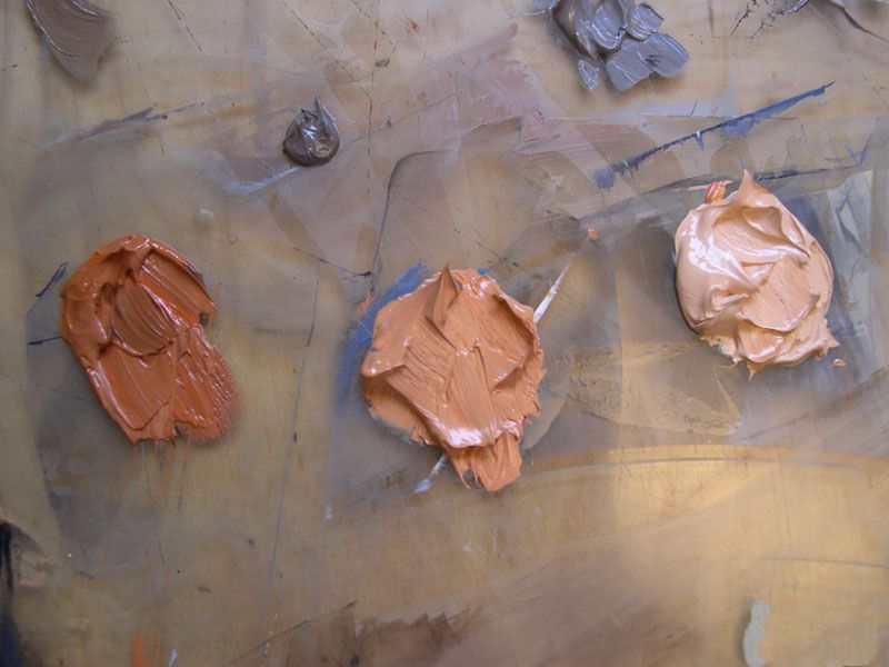 画人物的脸 人肉音调,无论是白人、非洲或亚洲一些桔子。这个橙色然后与棕色或互补的颜色混合凉爽或温暖/减轻或变黑。我开始画人肉预拌三个主要大型橙色的颜色也与价值有关。我改变公式根据每个人是粉红色的或棕色。自这两个模型都是相当苍白,所以肉体音调进入朝鲜的最轻地区肤色将冷却器对光线和阴影地区的温暖。