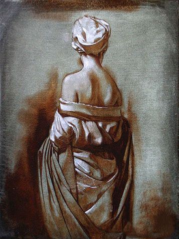 我画这12×9英寸亚麻画布上彩色灰色基调的深蓝色模式和生赭,我减少90%松节油和10%的混合格雷厄姆胡桃木/醇酸油漆中。我用抹布擦下来达到我想要的价值。我最喜欢布朗是Gamblin沥青偏暗,我使用它。我混合一点核桃/醇酸介质进入漆堆使它更柔软和敏感,并帮助它干得更快。我用旧荷兰纯铅白和黄赭的轻拍我的灯。我还一个小核桃/醇酸介质进入油漆。