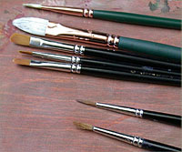 我使用两个银刷1003榛子,三个很便宜Loew-Cornell人工榛子在工艺品店我买,丹尼尔·史密斯# 4貂,一个古老破旧丹尼尔·史密斯# 4作为一个搅拌器。