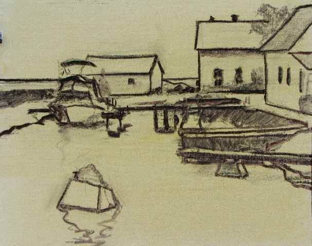 首先画一个大纲的主要元素。我使用一个减少象牙黑和永久茜素的混合物。开始做笔记的任何和所有阴影;在这张照片太阳高所以只有几个突出的影子形状。