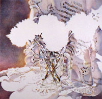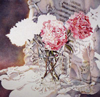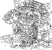 微妙的颜色反映在桌布上的鲜花和花瓶。并列的颜色——把颜色旁边另一个而不是直接分层增添趣味。桌布的孔和花瓶的细节定义和黑暗的靛蓝色和黑色。