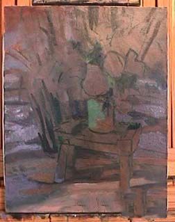 这是一个20英寸16英寸画布已经缓和的undermix有限的调色板颜色应用薄。然后使用alizerin草图被深红色夹杂着thalo绿色黑色。我稍微偏移表创造空间供观众欣赏这幅画。我也缩短和增厚的腿/表关闭了设计的座位。