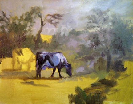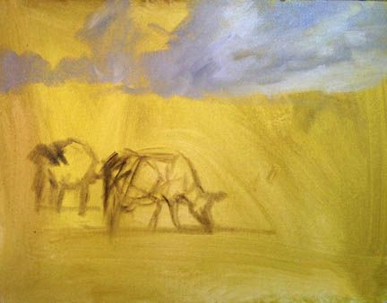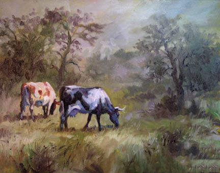 正如你所看到的,这幅画是灰色!在表面移动,我继续结合混合的深蓝色,暗红,烧棕土,thalo绿色、黄色赭石和白色填写画布区域遥远的和凉爽的。刷牛附近有一些更多的混合,和他们足够薄underpainted区域。我画,我总是注意对比的地区,那里的光区牛将树叶的较暗的通道。所以这幅画还在继续!11 x 14石油。