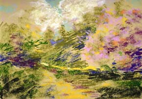 使用更强的颜色,开始把更多的定义,我现在工作树形式使用更多的行,和添加更多的云的形状。亮粉色、橙色和红色的粉色花朵。我现在开始画结构侧击,为了给运动以及纹理。你可以观察这地面的坡度和遥远的角树的形状。