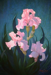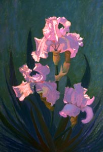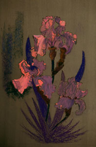 薄层姹紫,red-violets和暗粉红色建立花朵的阴影区域。花很快就消退了,他们必须完成背景前,除了快速笔记来帮助建立的价值关系。光通过开花是一个非常重要的因素,描述了透明度和温暖的布鲁姆的“心”。强烈的温暖应用于花的中心创建这种感觉。虹膜的叶片开始有深蓝色的紫色,其他为暗棕土绿色的变化。彩色是用于混合和软化的初始中风的颜色。