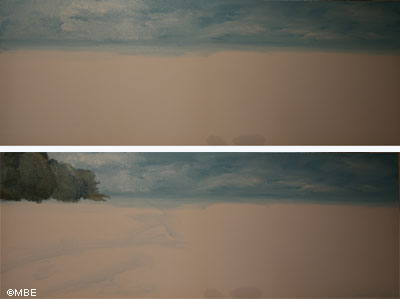 一旦我完成了画天空,我让它干的沿海山开始前向远处地平线上消退。再一次我没有勾画绘画上的山,因为我有很强的形象在我的脑海里,我想做的,没觉得有必要。山上画在灰色混合生赭,普鲁士蓝,和钛白,比例不同产生不同的音调。