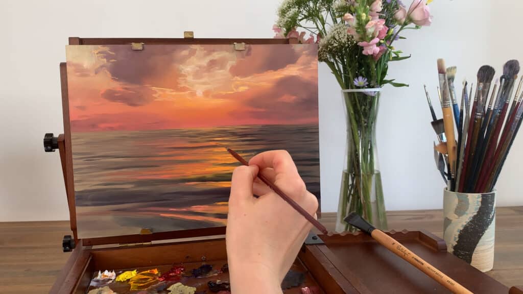 当我进行时,我会混合硬边缘,确保不要过度混合,以免丢失高光中的清晰度。高光是橙色和黄色的真实混合,在较暗的云层中显得饱和。这个天空部分已经完成了,所以是时候开始画海了。