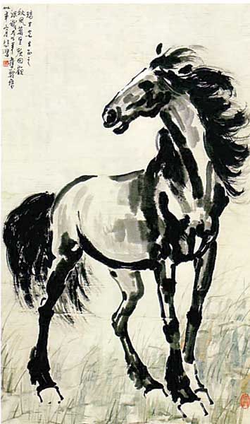 正因为古今绘画大师名家们擅长“以书入画”,所以“以书鉴画”也就成为鉴其作品真伪的一个不可或缺的依据。以近现代中国画坛大师徐悲鸿先生为例。徐悲鸿早年拜康有为为师,广临名碑,打下了深厚的书法功力,他的书法融魏碑、汉隶、二王行书于一体,秀丽而厚重,形成了具有鲜明个人风格的“徐氏书体”,这种书体不是一般的造假者可以轻易模仿像的。我们看两张拍场上出现的仿品,一件《双马图》仿造自北京徐悲鸿纪念馆藏真迹《三马图》,另一张《立马图》明显克隆自馆藏真迹《霜草识秋高》,两幅伪作虽极尽抄袭模仿之能事,但无论款书还是画中笔墨的运用,同真迹都有天壤之别,根本不可同日而语。徐悲鸿的书法功力,我们可以从他的书法真迹《招魂诗》中看的一目了然,笔势连贯,一气呵成,秀中有刚,流利自然。反观赝品,矫揉造作,苍白无力,全无神韵,乱写一气。