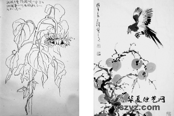 回忆过后,孙老指着速写簿中的几幅花卉速写,以惯有的自勉自省的口吻说:“《向日葵》、《玉米》、《花》这几幅还可以用。我现在画速写和那时不一样了,总结归纳了一些知识,例如速写――慢写、写生(照写)――默写、草写――楷写、详写――略写、近距离――中距离――远距离等,这是学习中国画的速写……”