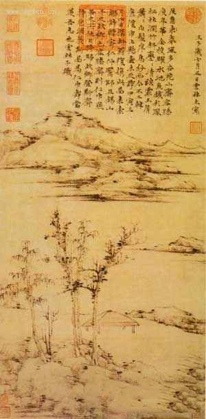 ③倪瓒的《容膝斋图》。倪瓒的画,笔墨简淡松秀,意境萧疏荒寒,构图别具特色。这幅画中所表现的是平远山水:近处是山石陂陀,三两株萧瑟林木交织眼前;中间是以留白的方式表现春意初临时的湖光波色;画面的上方则远岫遥岑,横于波际。这种三段式的构图方法是倪瓒山水的典型特征。