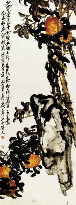 ⑦吴昌硕的《桃图》。吴昌硕的花鸟画大多是立轴式的构图,而且布势上一般为顺势较多,但也有极矛盾的图式。《桃图》这幅画的构图分为两个大势走向,一枝桃枝挺直向上,另一枝反势向下,利用一块山石介于两势相交处作为转接,竖向长款冲和奇势,使画面险中有稳,富于变化。