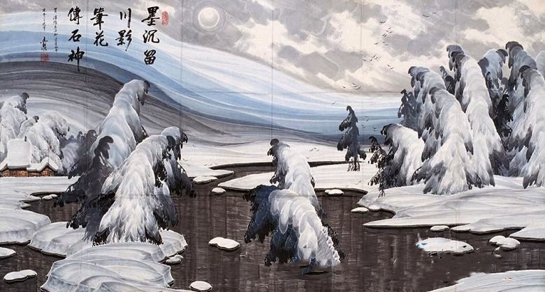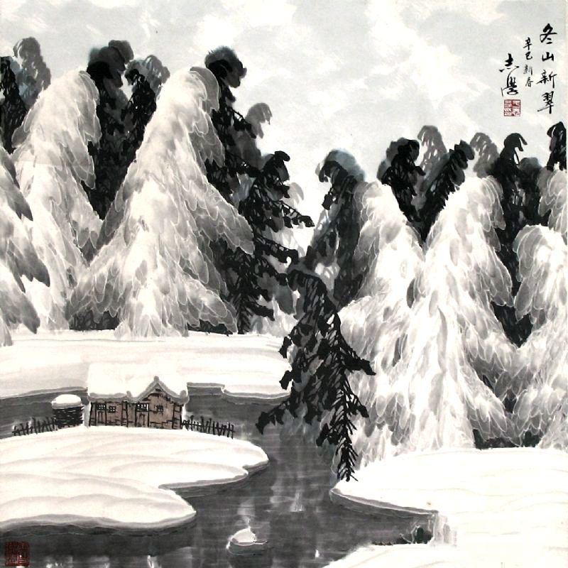 在生宣上淋上矾水,干后画墨竹;干后,再以饱和矾水点画竹上积雪;干后,在画纸背面喷点或烘染水墨。