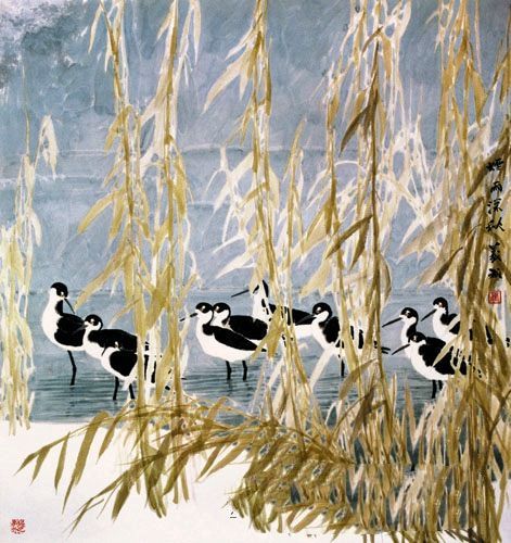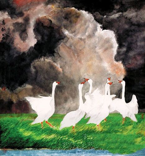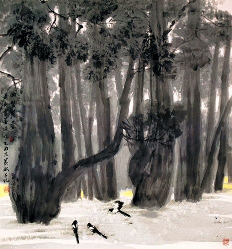 2.胶矾作画,趁湿点画渲染。