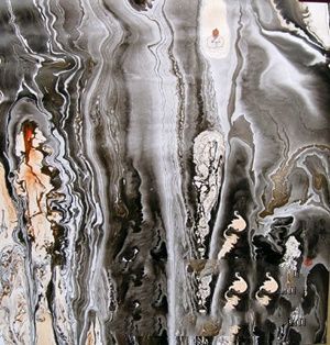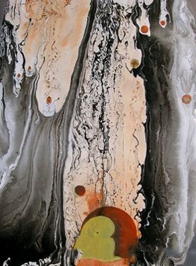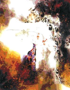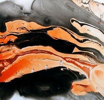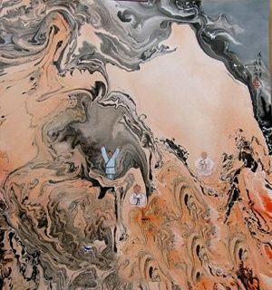 这个画法受贵州布艺蜡染美丽的肌理、自然流畅的“冰纹”的启发。这种少数民族传统艺术表现富有现代感,将它的制作原理引进现代水墨画,会出现新的视觉效果。我在《渔归》(见图)中尝试了这种画法。画面通过比较大胆的夸张的手段,勾画了富有民间装饰意味的人物及一串鲤鱼,表现出中国画强调线条的效果,并用点与线的交叉构成这幅作品的审美韵味。少女的裙子用了蜡染的画法。黑色、群青与朱红形成的强烈色彩,使作品充满了新鲜感。其方法是先将固体的蜡按构想或有形或无形地画在宣纸上,然后用墨色或彩色(水彩、粉彩均可)涂在上面,凡沾了蜡的地方都没有被染,颜色被统一在蜡的自然纹理中了。另一种方法,是将加热后的液体蜡根据经营位置的需要涂于纸上,干后用手掰碎再涂颜色,做法与真的蜡染一样,也会收到很好的效果。