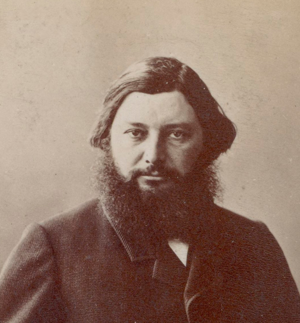 居斯塔夫・库尔贝(Gustave Courbet,1819--1877) ,1819年生于法国的奥尔南,自幼天赋聪颖、相貌出众,既高傲自大、自命不凡,又热情奔放、慷慨大方,从中学时代;就成为同龄朋友们心悦诚服的领袖。1841年,他的父亲送他到巴黎念大学,要他学习法律,但他却立志做一名画家,在皇家美术学院和贝桑松美术学院学习。当他23岁时就已掌握了自己风格的主要因素。在古代大师中,他最欣赏17世纪西班牙画家委拉斯贵支的技巧,专心地临摹过不少收藏在卢佛宫的委拉斯贵支的作品。 在1846年间他创作了以自己为主题的《抽烟斗的人》。这幅画富有灵感,暗红色的背景,灰色的上衣,带有灰绿色阴影的白色衬衫,黑色的头发和胡子围笼着带有橄榄色阴影的微红脸部;这个脸画得犹如提香的手法那有有力。肩膀厚实,脸部的柔和感觉表现得极其雅致。这种雅致的感觉还扩而及于深调子,涉及突出在深暗背景上的形体,使得这个“得意而调皮、富有幻想的、似乎沉醉在熏污烟斗的烟雾之中的”脸,盖上了安逸而幸福的烙印。造型的想象力是雅致的绘画处理基础;以现实主义手法表现出来的安逸姿态,突出着浪漫主义的幻想神情。在这幅自画像上,库尔贝的自我欣赏得到了完美的抒情体现。后来,他画出了更加重要的作品,在绘画处理方面更加丰富的作品,可是再没有一幅比这幅更加优美了。正由于库尔贝的自我欣赏,他的许多自画像成了杰作。