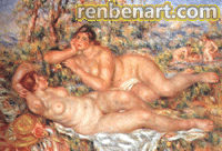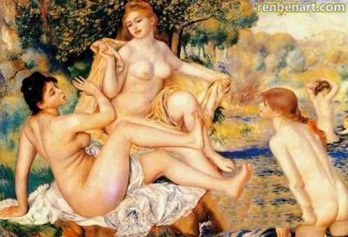??? 雷诺阿在这副画中,描绘出河边洗浴后休憩的裸女。近景三个浴女容光焕发,具有丰腴的官能美特色,她们的身体荡漾着一种青春风韵,又显得健康成熟。玫瑰色的肤色显示了少女的壮实和健美,极细腻的笔触绘制出女性丰满柔嫩的皮肤表面,塑造了她们那富有弹性、充满活力的肉体,赋予她们青春美和生命的欢乐