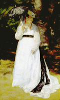 莎丽 创作于1867年的“莎丽”在1868年的官方沙龙展出,并取得了成功。这幅画从居斯塔夫・库尔贝(Gustave Courbet,1819-1877)借用了自信、庄重和沉着的设色手法。那光闪闪的发辫,傲慢慢的模样,招人的目光的同“罗曼・拉柯小姐”一画相比,雷诺阿的诗神在这幅画上要严格得多。但如果说雷诺阿的灵感是外来的,那么他的形象观察和表现手法的魅力却是他自己的素质。他不是为描绘人体而画画;他想表现出妇女身上衣服的白色和阴影――被黑色绦带所隔断的白色,敷在淡黄和浅红的脸上的灰色阴影,黄绿色背景上的阳伞的灰调子。那一片既起掩盖作用,同时又起加强作用的深灰调子,就像温柔的抚爱似的,显示出了一种和库尔贝不同的柔和,也表现了与柯罗和色调不同的一种调子特色。虽然这幅画的颜色略为含蓄了些,但是富有说服力的。