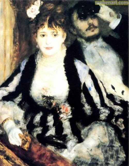?? 画家依据在剧院里得到的印象,创作了包厢中的盛装女性。有趣的是,这是在室内完成的印象派绘画。画家成功地表现了剧院中包厢里的气氛,虽然只画了两个人,但画家明显地突出了那个贵妇人的形象,化了妆的贵妇人与身后的绅士形成鲜明对比。