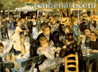 红磨坊街的舞会 “红磨坊街的舞会”是描绘巴黎的一个露天舞会。这幅画既表现了一个狂欢的场面,人们各种各样的幽默类型,又在贵族舞会的场面中企图捕捉一种无忧无虑生活方式的情趣。我们既可以欣赏欢乐的人群的行动,也可以陶醉于舞会之美。但雷诺阿创作此画的兴趣却别有所在,他想呈现出鲜艳色彩的悦目混合,研究阳光射在回旋的人群上的效果。虽然这幅画显得“速写化”,似乎尚未完成。仅仅前景中一些人物的头部表现出一些细节,然而连那里也是用极其违反程式、极其大胆的手法画成的。坐着的那位女士的眼睛和前额处在阴影之中,而阳光照在她嘴和下巴上。她的明亮的衣服是用粗放的笔触画成的。然而这些人物正是我们集中注意的对象。往远处去,形象就越来越隐没有阳光和空气之中。