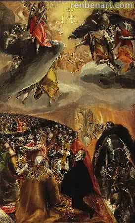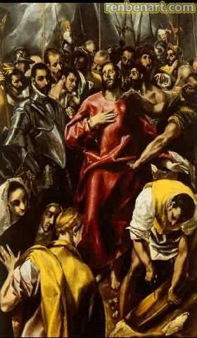 格列柯的艺术很长时期未被美术史肯定,直至本世纪初,在当代流派的纷争之中,人们又重新想起了这位西班牙画家。他的特殊艺术品质始被许多人研究,从而也加深了对他的认识。据史料所载,格列柯知识渊博,兴趣多样,涉猎的面也极广泛。从他死后遗留下来的藏书中,人们发现他喜欢读希腊古代作家与意大利文艺复兴时期作家的文学作品。他收藏的希腊语、拉丁语、意大利语和西班牙牙语古代典籍很多,有普卢塔克的《名人传记集》、彼特拉克的诗集、阿里奥斯托的《疯狂的罗兰》以及特兰托宗教会议文件。他还研究过意大利阿尔贝蒂等人的建筑专著。也许因为这种广闻博识,使他容易充满幻想。作为西班牙伟大的宗教画家,他的画风不能与苏巴朗、里贝拉、穆立罗等人相比。他是一个充满矛盾和幻想的思想家,他的艺术是他的思想的映象,这一幅画也不例外。此画约为 191×98厘米,现藏华盛顿国立画廊。