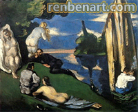如像“田园诗”(图2)这样的画,给人的印象就像是一种摆脱不掉的梦幻景象。塞尚不是一般地欣赏自己的情欲的。他是完全沉醉于情欲之中了,因此,他也不是一般地在画布上描绘这种情欲,而仿佛是在激发观众的情欲。颜色紧张得不得了,不仅天空的蓝色和云彩的黄白色与橙黄色,而且还有前景略染着一点玫瑰色的灰色、黑分棕色都是如此。形体不是借助轮廓或明暗而突出出来的;这是听任画家的感官支使而或隐或现的一大片一大片颜色。这些形体,如果能够得到由明暗颤动所造 成的气氛的衬托,才的可能站得住。可是,物性感和物质的厚实感没有给明暗和空气留下任何余地,所以这些画只能给人以故弄玄虚的印象;它们所表现的,似乎就是一种浪漫主义的幻想,一种脱离现实的欲望。因此,在观众看来似乎是素描的缺陷的那种东西,实际上是由于千方百计一定要超越公认的素描范围,使人物形象具有一种类似云彩或小船的形状的意图所造成的。如果说这些尝试结果是失败的,那就是由于情欲过剩,艺术还控制不住情欲的关系。