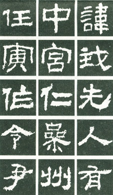 《衡方碑》外紧内松、阔大壮美的书风,要求同时具备左右竖的字将竖笔相向或向背书写。这也是《衡方碑》的突出特点。如图中“寅”、“宫”二字。