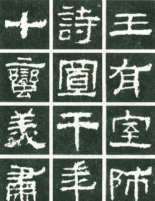 方笔起笔时纵向取势,凌空而下,正锋直入,笔酣墨畅,行笔迟涩凝重,神全力足,回收上提迅捷,多见斩钉截铁之势。如附图中“十”字的起笔,“诗”字右部的上两横,起笔方峻凌厉,行笔积点成形。